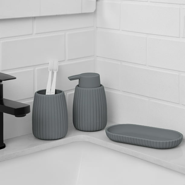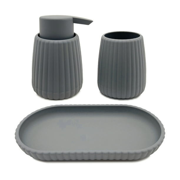 Upgrade your bathroom décor with function and charm with the Mainstays Rubberized Plastic Ribbed Accessory Tray. This sleek accessory tray features a ribbed design that adds a touch of modern flair to your sink or countertop. This rubberized plastic bathroom accessory tray provides durability & versatile uses. Ideal for organizing your matching soap pump & toothbrush holder, jewelry, makeup, or bars of soap. Available in 4 neutral colors that will coordinate seamlessly into any bathroom decor. Elevate your bathroom experience with this fun and sleek Mainstays ribbed accessory tray.