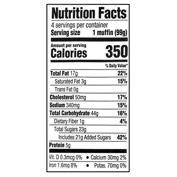 - 4 regular-sized baked muffins packaged in resealable clamshell