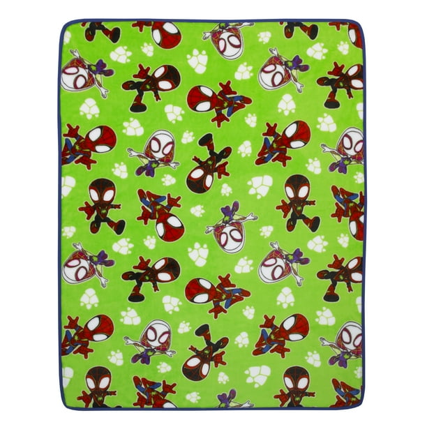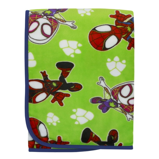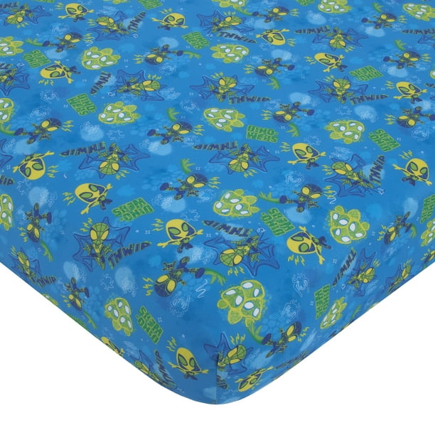 Reptil, a new Spidey friend who has the ability to change into dinosaurs, joins Spidey and his Amazing Friends in the Spidey Dino Web 5-Piece Toddler Bed Set. The collection has a reversible comforter, flat sheet, fitted sheet with elastic edges for a snug fit, reversible standard size pillow case, and an extra soft and cozy plush blanket, all in bold shades of blue, green and red. Everything you need to decorate your child’s room in one convenient bundle! All items fit on a standard size toddler bed, using a 28″ x 52″ crib/toddler mattress. Perfect for your toddler boy!