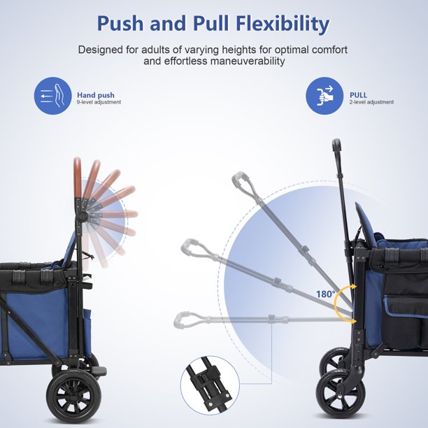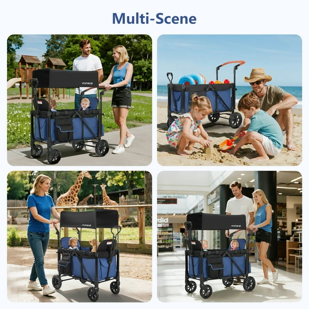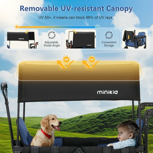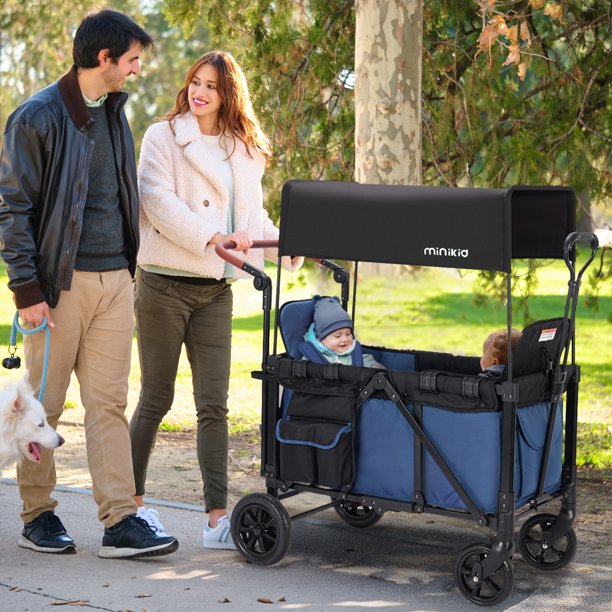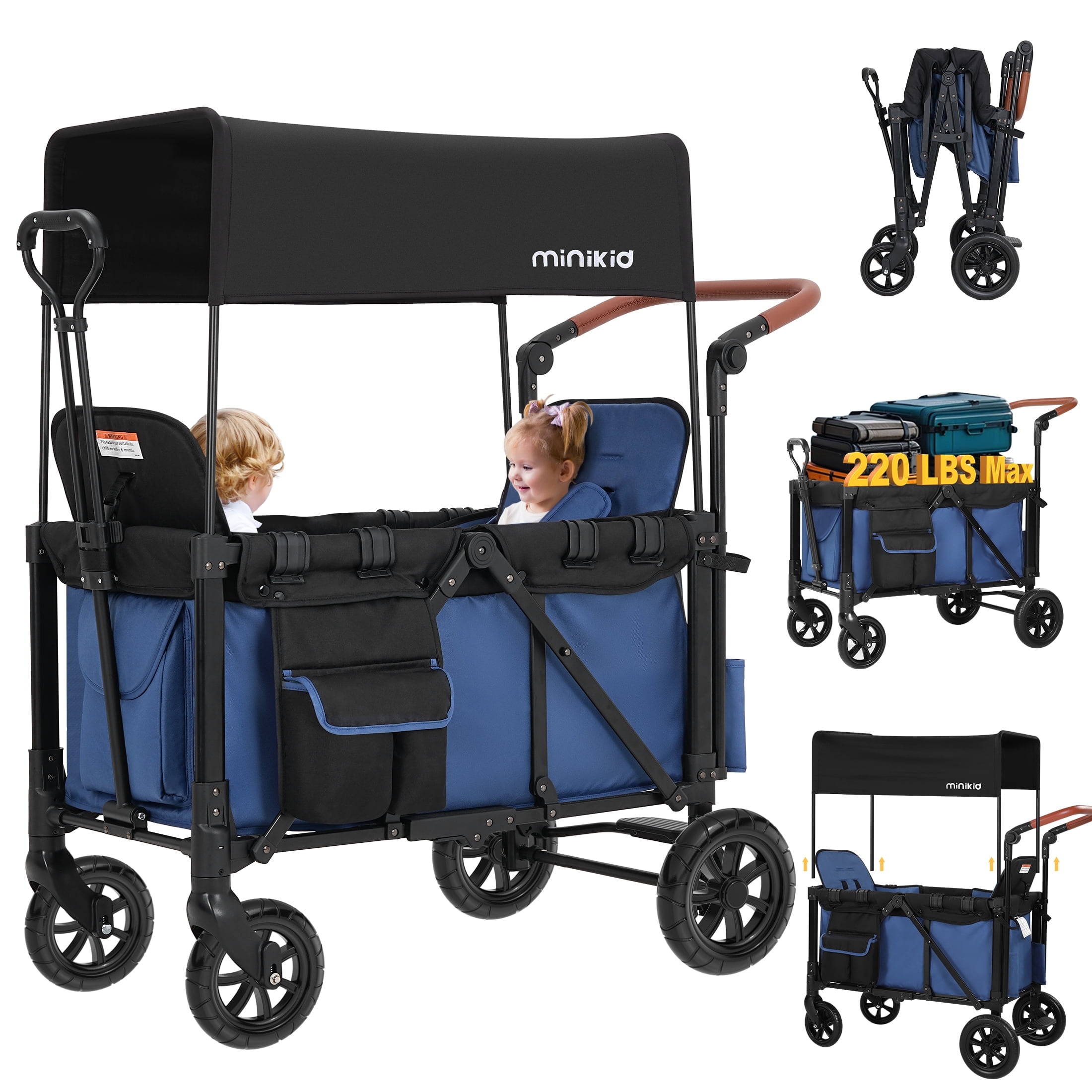 Minikid 2-in-1 Wagon Stroller with Adjustable Canopy, Rain Cover, Mosquito Net, Blue