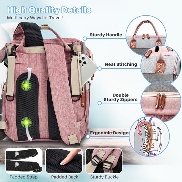 Morfone Baby Diaper Bag Backpack, Multifunction Waterproof Baby Bag with USB Charging Port, Stroller Straps & Pacifier Case Unisex, Pink