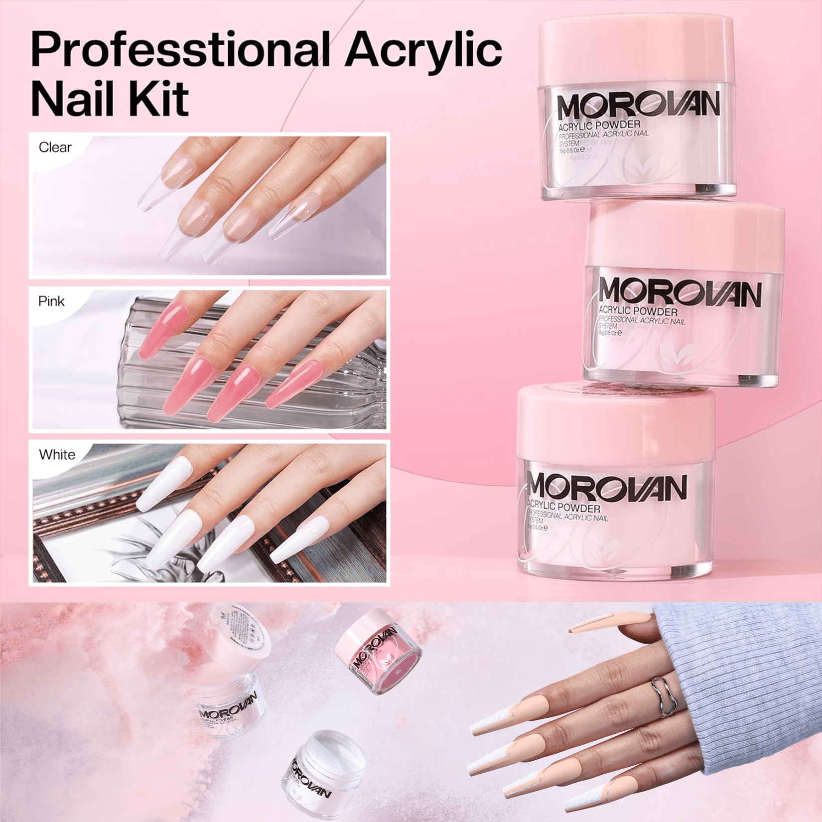 - Morovan 3 colors acrylic nail powder set is made of nontoxic materials, and special protection formula, providing flawless consistency, superior adhesion, self-leveling and bubble-free application, while delivering exceptional strength, durability and natural-looking to nail enhancements.