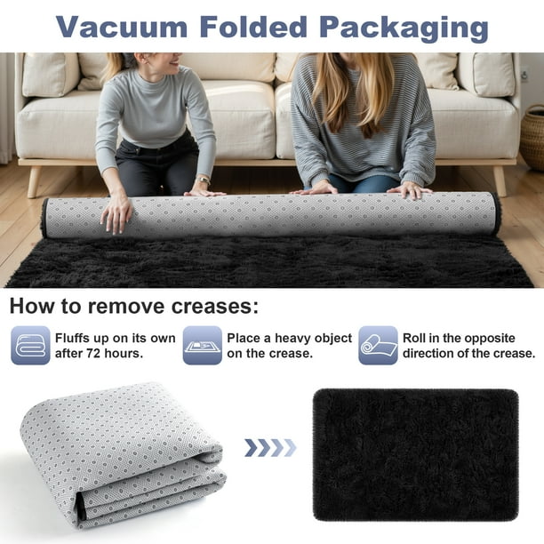 • 1. Since this rug comes with a vacuum Packaging bag, it’s normal to see the fibers on the rug is not fluffy enough and there will be some creases. Please lay it flat for 48-72 hours and wait patiently for its recovery.