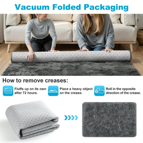 - 1. Since this rug comes with a vacuum Packaging bag, it’s normal to see the fibers on the rug is not fluffy enough and there will be some creases. Please lay it flat for 48-72 hours and wait patiently for its recovery.