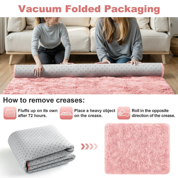 - 1. Since this rug comes with a vacuum Packaging bag, it’s normal to see the fibers on the rug is not fluffy enough and there will be some creases. Please lay it flat for 48-72 hours and wait patiently for its recovery.
