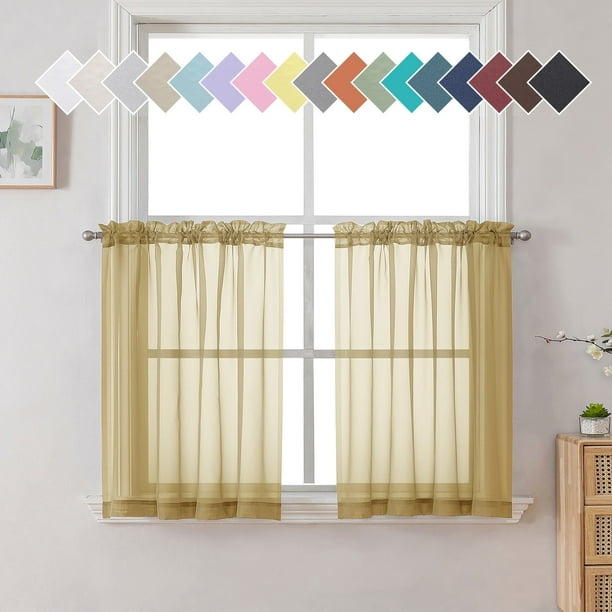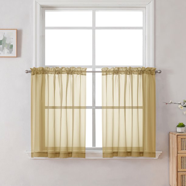 OVZME Gold Sheer Kitchen Curtain Tiers 2 Panels, Light Filtering Small Curtains for Bathroom Living Room Cafe Basement ,W42 x L24 inch, Set of 2, Gold
