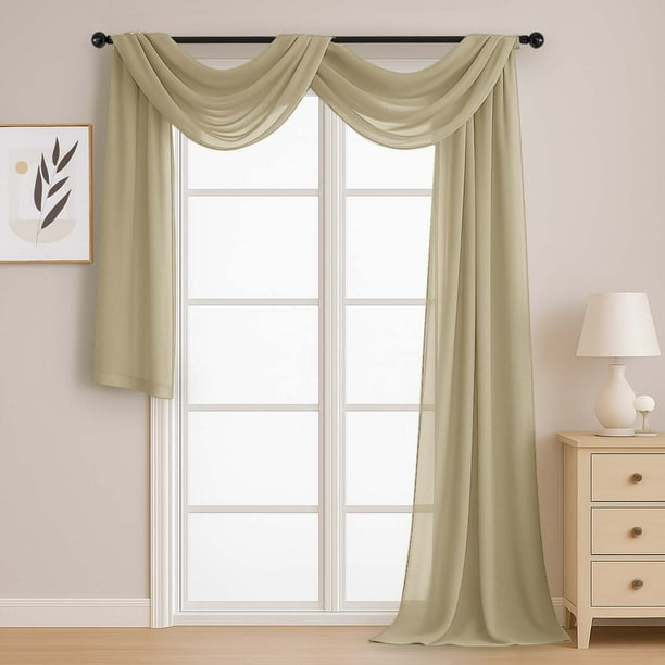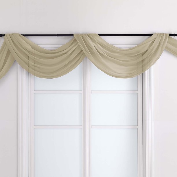 • Size & Quantity: Each pack contains 1 sheer scarf valance, 42″ wide and 216″ long. The sheer scarf has 2″ rod pockets at both ends, so it can be used not only as a curtain, but also as an elegant scarf valance.