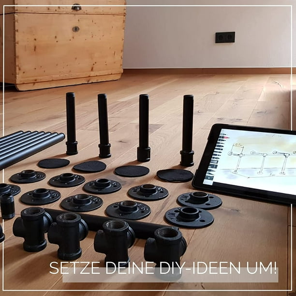 Create custom furniture, clothing racks, or shelving systems with pamo DIY pipe fittings – the perfect components for modern industrial projects. Made from durable malleable cast iron and finished with a scratch-resistant black powder coating, these 3/4″ pipe fittings offer strength, stability, and timeless design. Whether you’re building a wall-mounted clothes rack, a freestanding unit, or industrial-style furniture, the universal 3/4″ thread allows you to combine all pamo components with ease. Our selection includes elbows, connectors, tees, and flanges – ideal for creative configurations. The coated surface prevents rust and wear, making these fittings suitable for both indoor and sheltered outdoor use. Designed for DIY enthusiasts and professionals alike, the pamo pipe fittings offer flexibility, long-term durability, and a clean matte-black look.