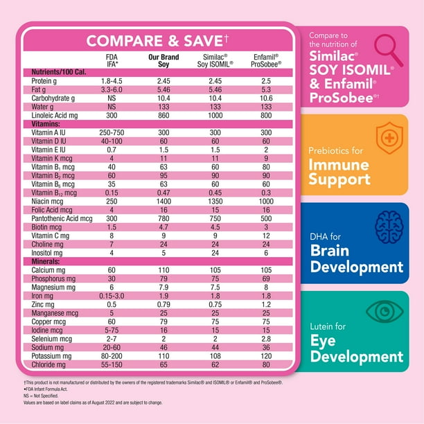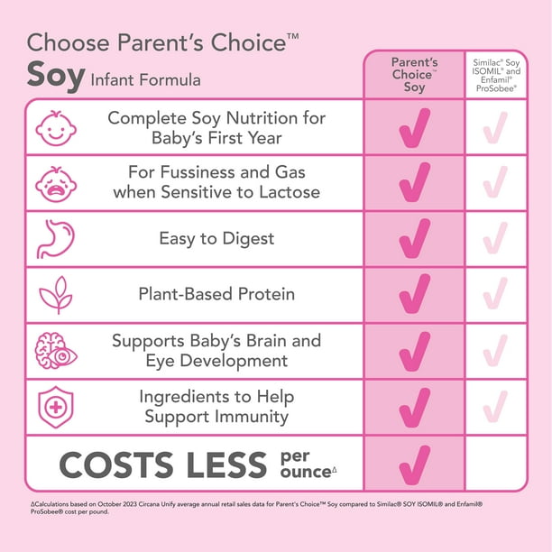 Compare to the nutrition of Similac Soy Isomil and Enfamil ProSobee. Another all-nighter pacing the floor with your crying baby? Ask your health professional whether Parent’s Choice Soy Infant Formula with Iron Soy-Based Powder could be an option for your lactose-sensitive baby. Soy formula provides complete nutrition for babies 0-12 months old, but without the lactose of milk-based formulas that may contribute to baby’s fussiness and gas. DHA, Lutein and Vitamin E. This formula is manufactured in a facility that adheres to the parameters set by the U.S. FDA for safety and quality. This product is not manufactured or distributed by the owners of the registered trademarks Similac Isomil or Enfamil ProSobee. Soy Infant Formula does not contain the identical proprietary ingredient blend of prebiotics, patented levels of nucleotides, lutein and lycopene in Similac Soy Isomil.