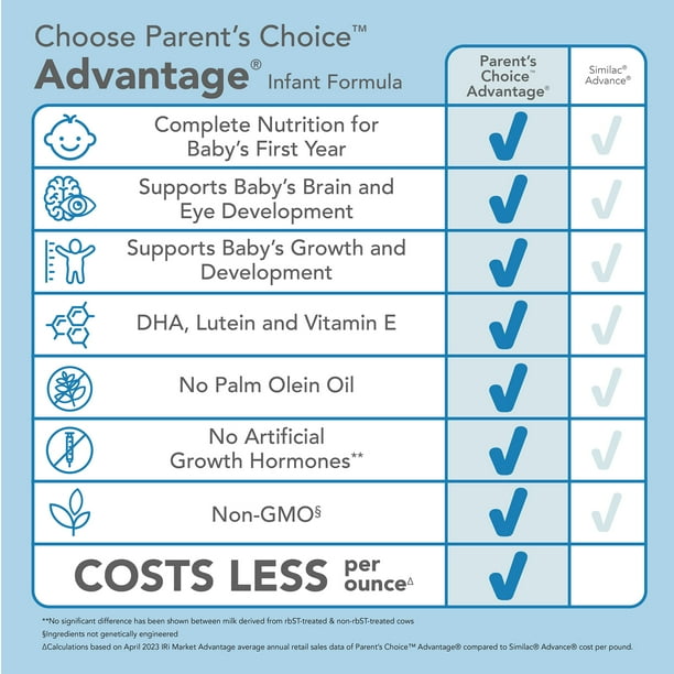 • Complete Nutrition: Parent’s Choice Advantage Infant Formula provides complete nutrition for baby’s first year; compare to the nutrition of Similac Advance