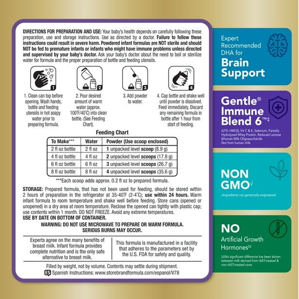 Compare to the nutrition of Enfamil Neuropro Gentlease. Parent’s Choice Gentle Premium Infant Formula Milk-Based Powder with Iron provides complete nutrition for baby’s important first year. Gentle on tender tummies, this baby formula is specially crafted for fussiness, gas and crying. For newborns, birth through 12 months. With expert-recommended DHA to support brain development. Each serving contains trusted ingredients for immune support. Gentle Immune Blend 6 with 2’-FL HMO, Vitamin C and E, Selenium, Partially Hydrolyzed Whey Protein, Reduced Lactose (has 20 percent of the lactose compared to our full lactose, routine, milk-based Infant Premium formula). Whey and intact milk proteins are partially broken down so that it’s easier for tiny tummies to digest. Human Milk Oligosaccharide, not from human milk. HMOs are immune supporting prebiotics commonly found in breast milk. Naturally occurring MFGM components from Whey Protein Concentrate. Milk fat globule membrane composed of proteins and fats. Certified Kosher by the Orthodox Union – OU-D. Non-GMO ingredients, ingredients not genetically engineered. No artificial colors or flavors. No artificial growth hormones; no significant difference has been shown between milk derived from rbST-treated and non-rbST-treated cows. This product is not manufactured or distributed by the owner of the trademark Enfamil Neuropro and registered trademark Gentlease.