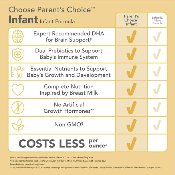 Compare to the nutrition of Enfamil Infant Formula. Inspired by breast milk, Parent’s Choice Infant Formula Milk-Based Powder with Iron provides complete nutrition during baby’s important first year. This easy to digest baby formula has been specially crafted to support baby’s growth and development. Expert-recommended DHA for brain support. Dual prebiotics support baby’s immune system. Non-GMO ingredients, ingredients not genetically engineered. No artificial growth hormones. No significant difference has been shown between milk derived from rbST-treated and non-rbST-treated cows. Certified Kosher by the Orthodox Union – OU-D. This product is not manufactured or distributed by the owner of the registered trademark Enfamil Infant Formula.