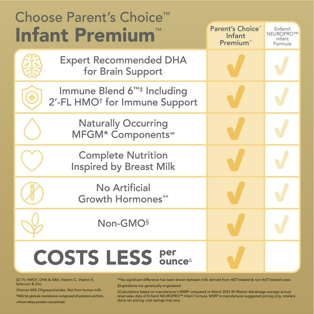 - Immune Support: For little ones ages newborn-12 months, Parent’s Choice Infant Premium includes Immune Blend 6 with 2’-FL HMO, DHA and ARA, Vitamin C, Vitamin E, Selenium and Zinc; collectively, these support a baby’s immune system
