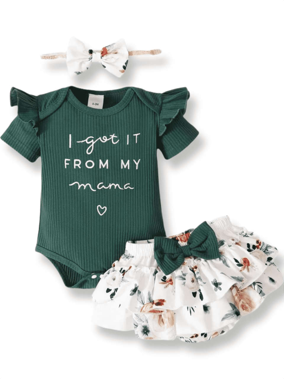 PatPat 3pcs Baby Girl 95% Cotton Short-Sleeve Letter Print Romper & Floral Print Layered Ruffled Shorts & Headband Set,0-18 Month