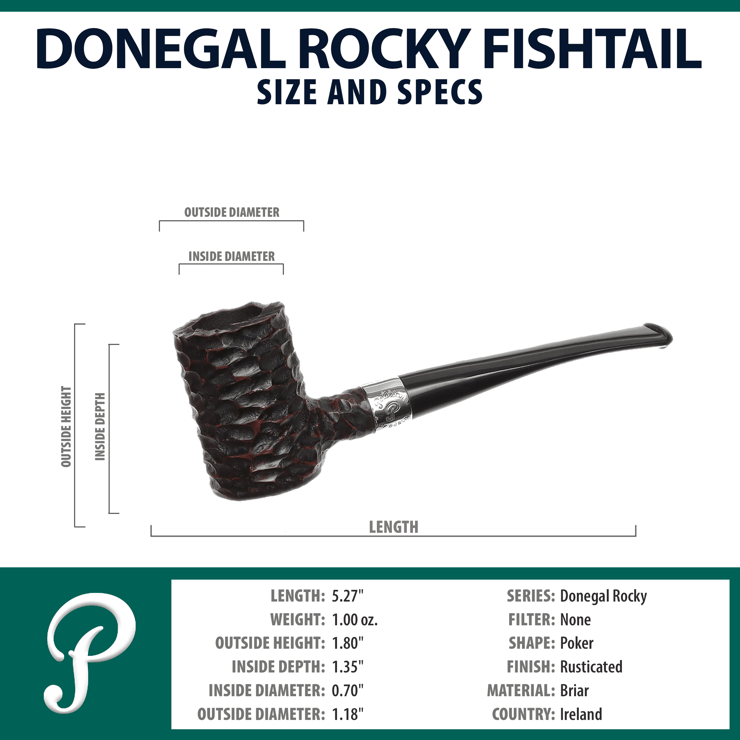 Brand: Peterson ~ Model: Donegal Rocky ~ Length: 5.30 in./134.62 mm. ~ Weight: 1.00 oz./28.35 g. ~ Bowl Height: 1.80 in./45.72 mm. ~ Chamber Depth: 1.35 in./34.29 mm. ~ Chamber Diameter: 0.70 in./17.78 mm. ~ Outside Diameter: 1.18 in./29.97 mm. ~ Stem Material: Vulcanite ~ Filter: None ~ Shape: Poker ~ Finish: Rusticated ~ Material: Briar ~ Country: Ireland ~ **Because each one is handmade, the measurements are approximate and will be slightly different with its own personality.DONEGAL SERIES: Named after County Donegal in northwest Ireland, Peterson’s Donegal Rocky series offers one of the Irish firm’s most distinctive and immediately recognizable finishes.