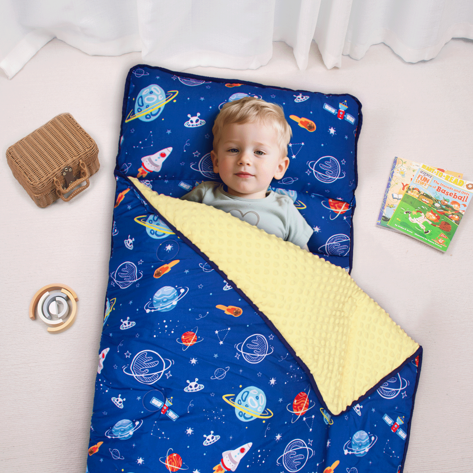 - Spacious for Growing Kids: Sized at 55″ x 22″ with a cozy 43″ x 35″ blanket, this generously sized nap mat gives active sleepers room to stretch out comfortably during nap time at kindergarten, daycare, or home.