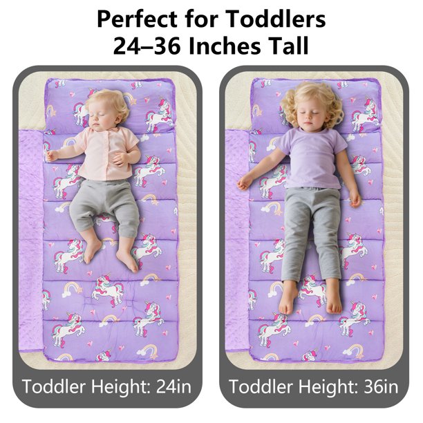 • 📏 Sized for Toddlers Aged 1–3: Designed for kids 24–36 inches tall, this nap mat fits younger toddlers perfectly—offering a cozy, secure spot for daytime rest.