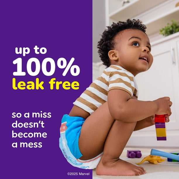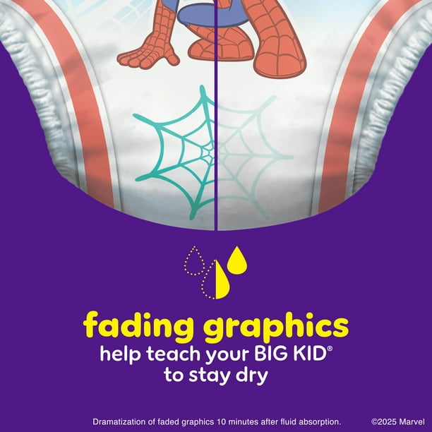 Start your child’s potty training with Pull-Ups Training Pants for Boys in exclusive Marvel designs! Each training underwear delivers easy changes with refastenable sides, allowing you to keep pants and shoes on your toddler. Pull-Ups Potty Training Pants feature up to 100% leak-free protection and targeted absorbency where boys need it most. Made with soft and breathable materials, these boys’ training pants are comfy with an underwear-like fit. They are designed for little hands to easily pull up and down for Big Kid independence. Only at Walmart, Pull-Ups has Marvel’s Spidey and His Friends. Tell your BIG KID a story…SPIDEY IS USING HIS WEB TO SAVE THE DAY and YOU can help keep him moving! Spidey’s web fades when wet, so let’s stay dry! When your child is ready to begin his potty training journey, the Pull-Ups brand can help. Visit the Pull-Ups website for expert potty training tips and resources. We’ve helped train 60 million Big Kids and counting!* Pull-Ups Boys’ Training Underwear are available in sizes 2T-3T (16-34 lbs), 3T-4T (32-40 lbs), 4T-5T (38-50 lbs) and 5T-6T (50+ lbs). (*US and CA)