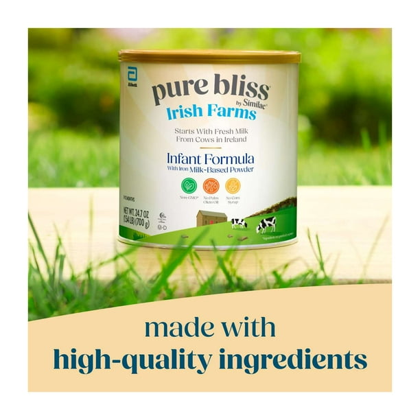 Pure Bliss by Similac infant formulas are made with high-quality ingredients, modeled after breast milk,† and crafted with care for your little one. As the makers of Pure Bliss, we’re inspired by the idea that providing nutrition for your baby should be simple. We’re here to support you on your journey with baby—to nurture their growing body and cradle them with love. Pure Bliss by Similac Irish Farms* starts with fresh milk from cows in Ireland. It is made with high-quality ingredients and has DHA to support baby’s brain and eye development. It also has no artificial growth hormones,‡ no palm olein oil, no corn syrup, and it’s non-GMO.§ * Not for infants or children with galactosemia. † Designed as a complete or partial breast milk substitute. ‡ Milk ingredients are derived from milk of non-rbST-treated cows, which is not different from milk of rbST-treated cows. § Ingredients not genetically engineered.