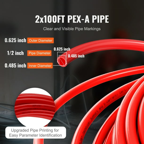 - SKYSHALO PEX-A Pipe: Made from high-quality PE material, this PEX-A pipe is carefully selected for superior performance. It has a length of up to 200FT and a diameter of 1/2 inch. The pipe body is upgraded with imprint markings, providing clear information on type, diameter, size, standards, and production date for easy understanding.