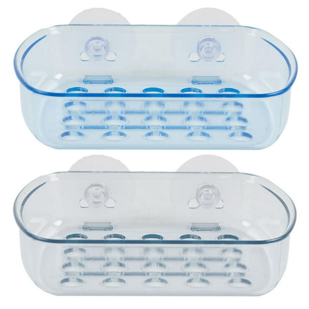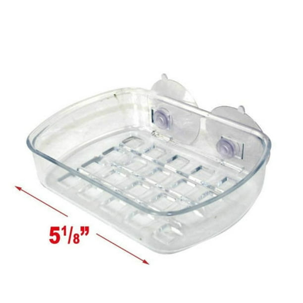 This durable, clear plastic soap dish features holes in the bottom for drainage and suction cups for secure adhesion to bath tiles.
