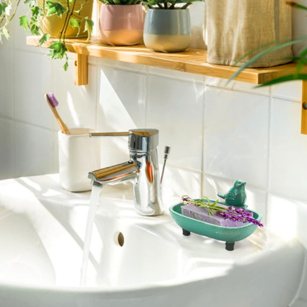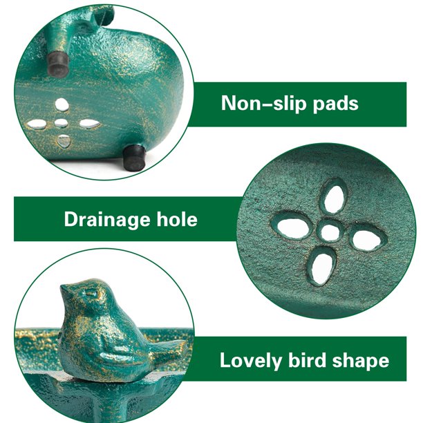 Elevate your bathroom or kitchen decor with the Sungmor Heavy Duty Cast Iron Hand Soap Holder. Crafted with an antique green finish, this charming soap dish features a lovely bird-shaped design and high-quality rubber pads to prevent slipping and scratching. The perforated design keeps your soap dry and refreshing, while the vintage-inspired style adds a touch of rustic elegance to any space. Measuring 12.8 x 10 x 7.2 cm, this practical soap container is a durable and decorative addition to your home.