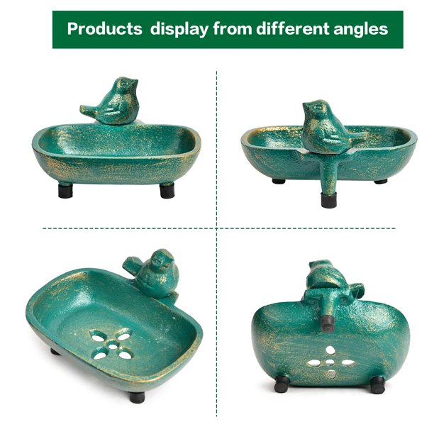 - Crafted from heavy-duty cast iron with an antique green finish, this soap holder is both durable and visually appealing.