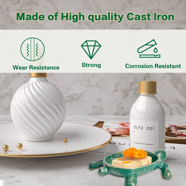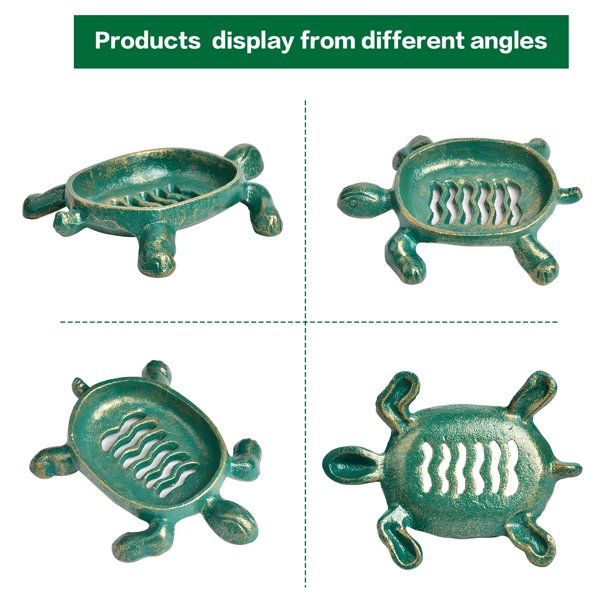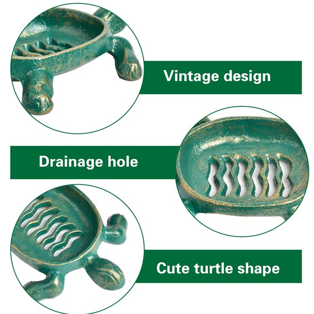 The soap dish is made of cast iron with drain holes and silicone pads at the bottom, which can be used to hold soap or store small items. It is also a beautiful desktop decoration that can be placed anywhere.