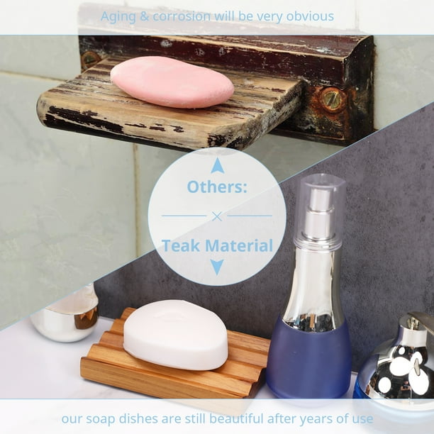WHY TEAK? Do you know? Teak has been used as a boat-building material for over 2000 years. Teak’s high oil content, high tensile strength, and tight grain make it particularly suitable where weather resistance is desired. Teak’s natural oil makes it useful in the bathroom, kitchen, and other wet environments, so we choose expensive teak wood as the raw material for our soap dishes and kitchen dish dry rack.NO MORE SOGGY SOAP: Each soap tray has a mountainous like structure, The heightened base keeps your bar shampoo and conditioner from sitting in water and allow air in to dry the bottom of the soap bar. ELEGANT SOLUTION TO SOAP SCUM: Our bathroom soap dishes with wood V grooves, which are designed to temporarily collect water and soap scum instead of running directly to the counter. ONE-PIECE DESIGN: Our natural soap savers made of one solid piece of natural teak wood without glue, nails or slats. Teak is often used for boat building and exterior construction. EASY CLEAN AND MAINTAIN: With maintenance-free design, our soap sponge holder easy to clean just wipe off with a wet paper towel or toothbrush to back to like new. MULTI-PURPOSE ACCESSORY: It can be used as soap holder, sponge holder for kitchen sink or bathtub, brush holder, Soapdish, Shampoo and Conditioner bars tray, Sponges, plants and cactus holder!