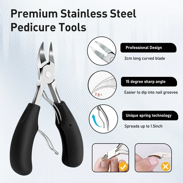 • Professional Trimmer For Ingrown Nail▶ Ingrown toenail removal kit can safely trim internal toenails and solve the pain caused by internal toenails. The blade has a 25 degree curvature that fits the curvature of the nail, allowing for precise trimming of embedded nails or sharp edges without damaging the nail. The 18mm blade of the internal toenail tool can penetrate deep into the side of the toenail, making it easy to remove internal and thick toenails.