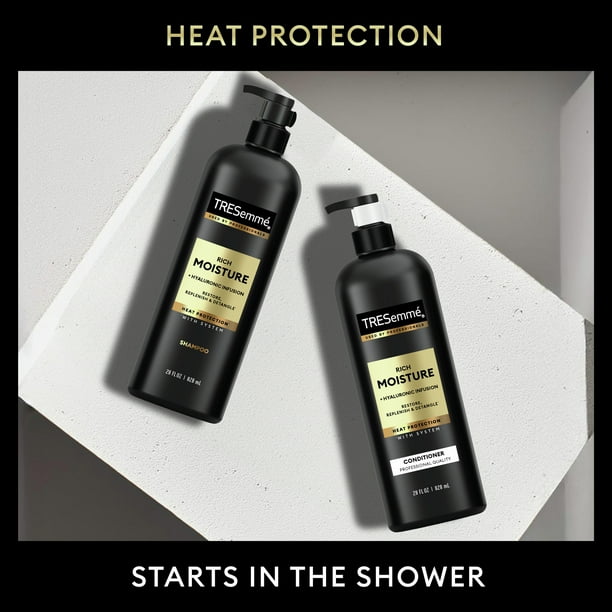 Tresemme Rich Moisture Shampoo and Conditioner Rich Moisture, 28 oz 2 Count. Discover the secret to hydrated hair with Tresemme Rich Moisture Shampoo and Conditioner. Infused with hyaluronic acid, this moisturizing system works to nourish strands to restore softness, replenish moisture & effortlessly detangle for healthy-looking shine. The Rich Moisture System is free from parabens, mineral oil, and DMDM hydantoin and is Certified Cruelty-Free by PETA to ensure your hair receives the best possible care without compromising on quality. To achieve the best results, start with Rich Moisture Shampoo and Conditioner and follow with Tresemme Protecting Heat Styling Spray for additional heat up to 450 degrees so you can heat style with confidence. Lock in your style and moisture with our Extra Hold Hairspray, providing all-day hold and frizz control. For adult use.