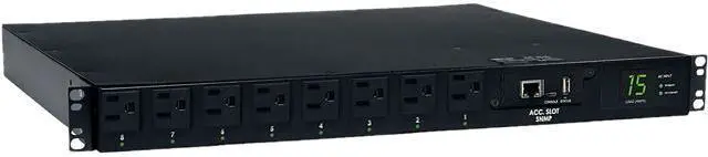 1U switched PDU with digital current monitoring ,network interface and 8 individually controllable outlets15A 120V capacity with 8 NEMA 5-15R outlets and 5-15P input connectionsBuilt in SNMP network interface supports individual outlet control and remote monitoring of PDU loading and site electrical conditionsOptional Auto Transfer Switch (ATS) supports a variety of advanced fault-tolerant and redundant networking applicationsSupports 2-7 ms. transfer between included primary and secondary line cords ,even with out of phase power sources |