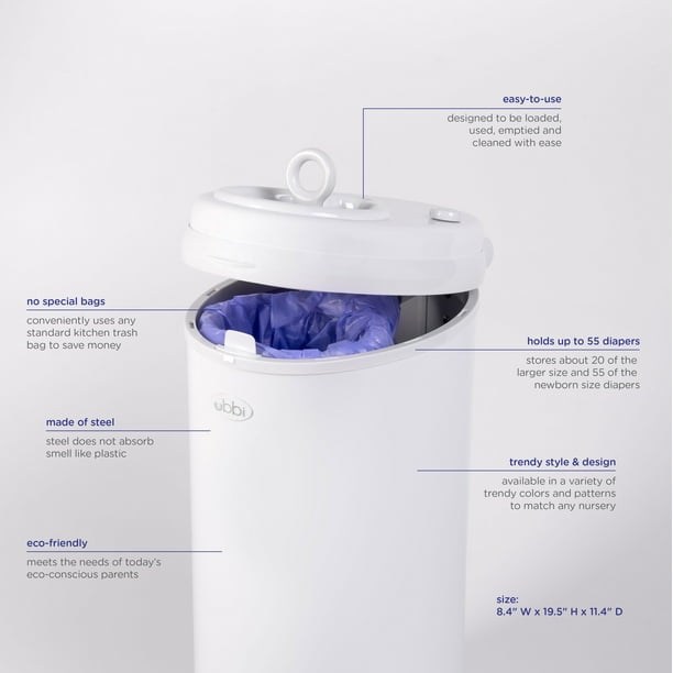 The award-winning Ubbi Diaper Pail has earned worldwide recognition for its superior odor control and convenience, representing a breakthrough in the diaper disposal market. The Ubbi Stainless Steel Diaper Pail is crafted from stainless steel and provides maximum odor control. It’s rubber seals are strategically placed to lock in odors, and the innovative sliding lid minimizes air disruption, ensuring that unpleasant smells remain contained within the pail. The optional childproof lock keeps little hands out. Catering to the needs of modern parents, our baby diaper pail is compatible with any standard trash bags saving parents money and time. Strategically designed to be the easiest disposal system to load, use, empty, and clean. Enter the world of Ubbi where innovative products are designed and created with parents and children in mind. A wide range of Ubbi branded products is now available for today’s modern parents that are looking for stylish and functional baby essentials. Do not clean with any harsh abrasives or liquids – even water! Wipe clean with a dry cloth to prevent rust. No special bags needed. Dimensions: 19.5” H x 8.4” W x 11.4” D. Opening Size: 5 inches diameter. Holds up to 55 newborn sized diapers.