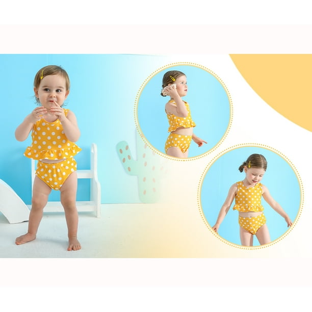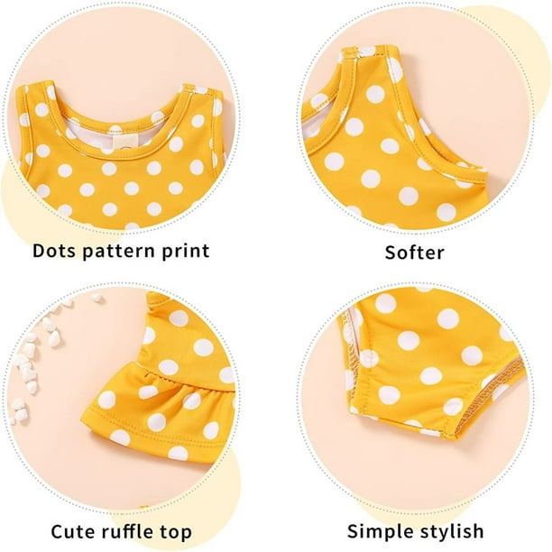 - 2.Product traits: Pink, Yellow or Blue toddler bathing suits for girls, dots or striped sleeveless tops with shorts, simple and stylish, your little girl wear it will look pretty.